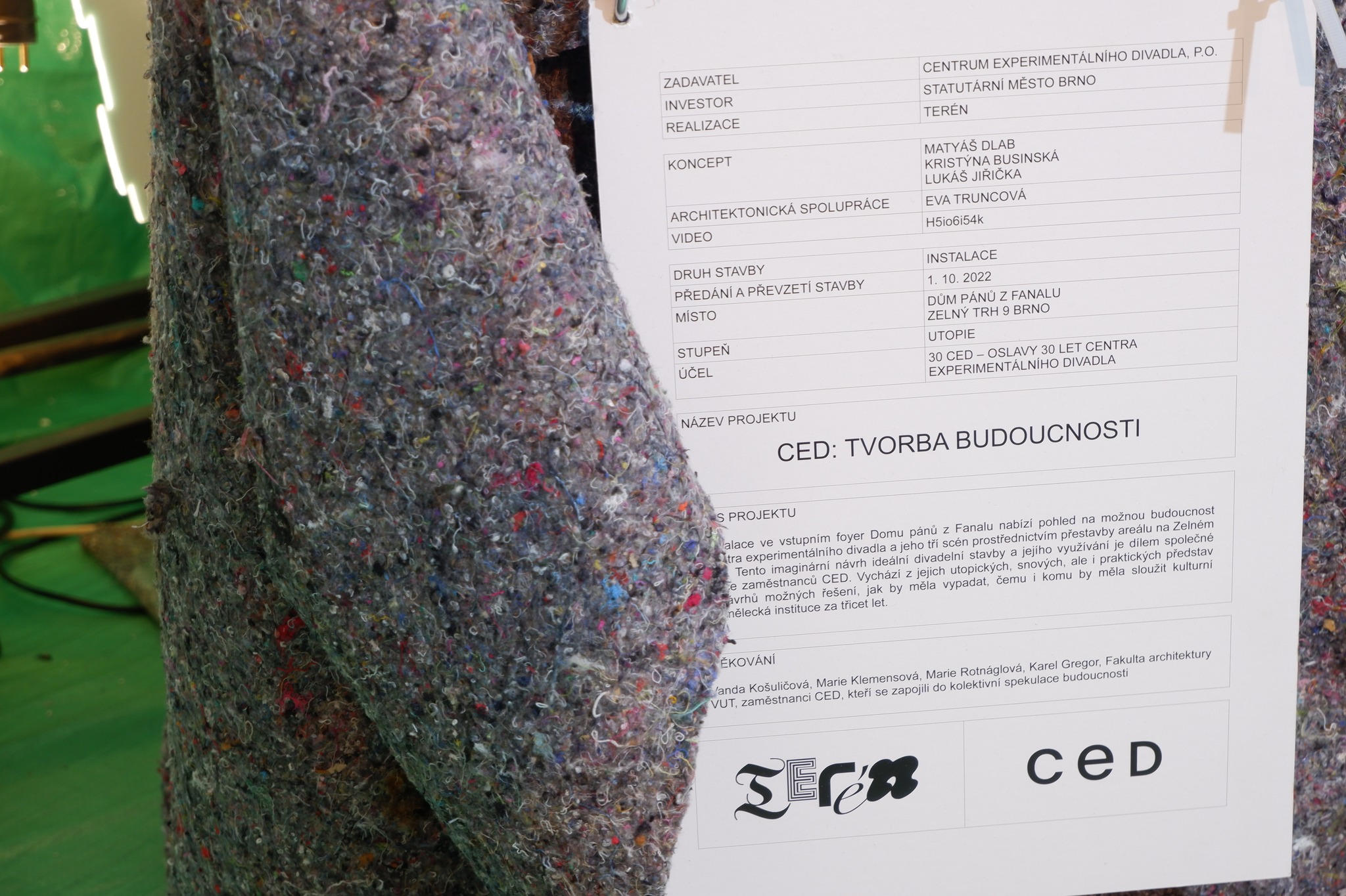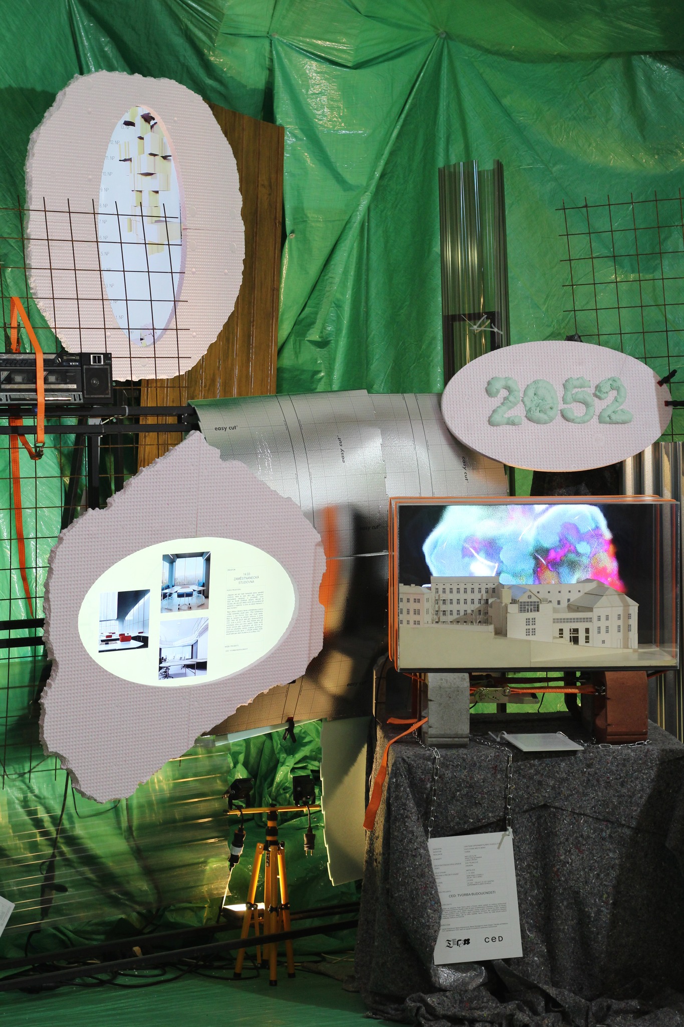 A speculative project about the nearby future of one of the leading Brno theatrical institutions. In the event of the 30th anniversary Centre for Experimental Theatre decided to create an imaginative installation questioning the future purpose and agenda of a public institution. The fictional superstructure extension of the CED building answers the needs and wishes of its employees and utopian direction in the horizon of 30 years based on elaborated questionaries.